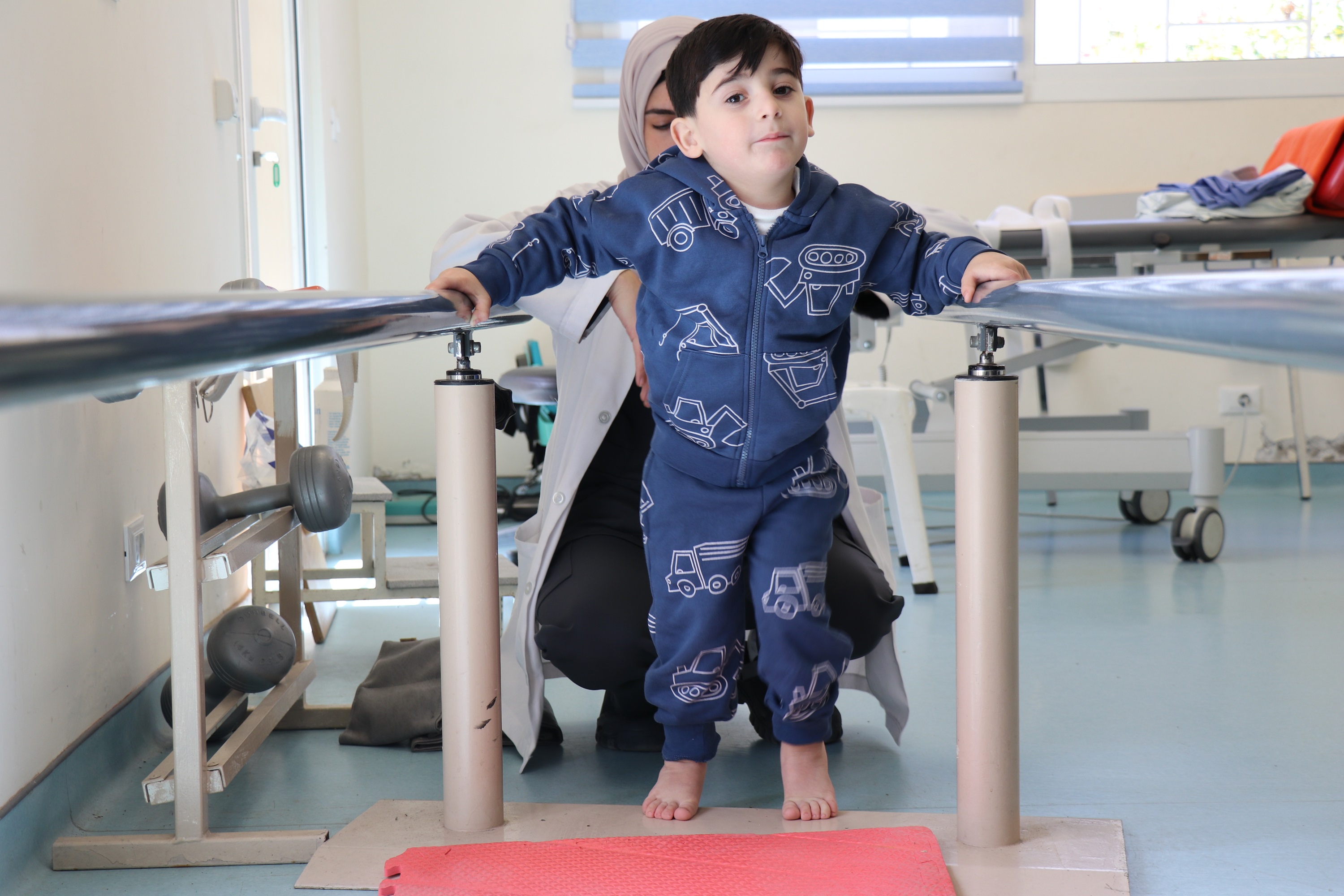 أول إنجاز حقّقه إبراهيم بعد مرور بضعة أشهر على بدء العلاج كان بأن يجلس وحده، ثم انتقل لمرحلة يقدر فيها على الوقوف، والآن… ها هو يقف بثبات على قدميه!