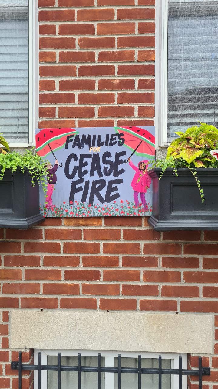 لوحة على مدخل منزل إحدى العائلات الداعمة لفلسطين في مدينة فيلادلفيا في الولايات المتحدة الاميركية